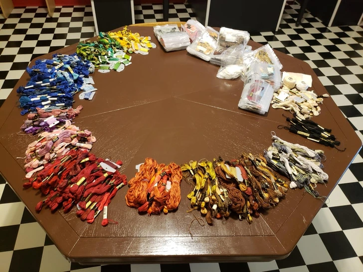 “I only started learning embroidery a few days ago and found 700 skeins of string for $5 at a thrift store. They retail for about $.50 each.”