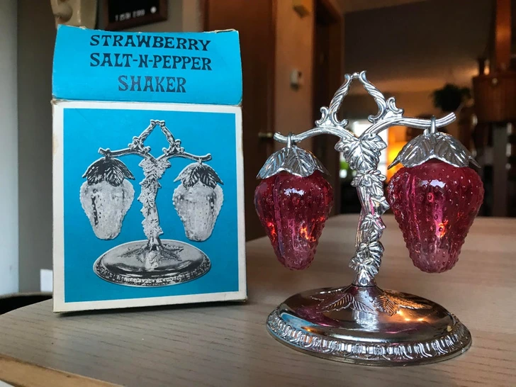 “Cute vintage strawberry salt and pepper shakers, new and in a box”