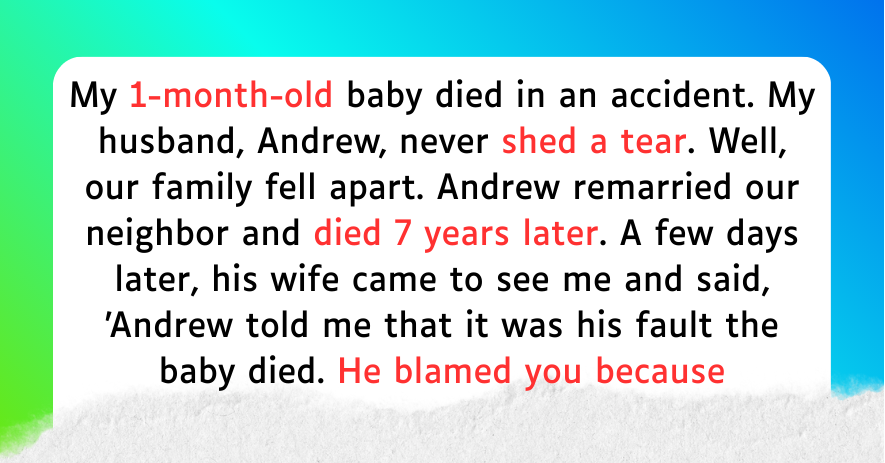- “When my one-month-old baby passed away in an accident, my husband Andrew showed no feelings. Our family splintered. Andrew married our neighbor and after 7 years, he died.