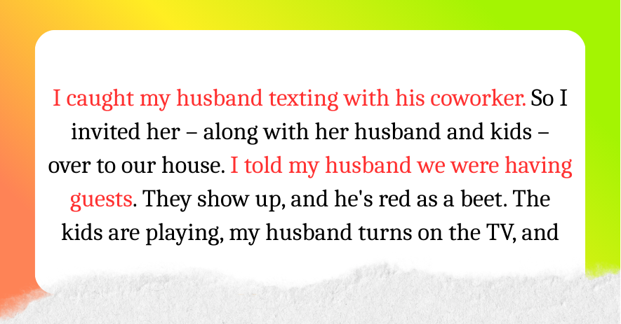 So I approached HR and suggested bypassing the tests, promising to excel in my role. She chuckled and accepted. I snagged the position on a trial basis. The two women, who completed the questions, couldn’t believe it. © Ward 6 / VK - After catching my husband texting a colleague, I invited her—along with her family—to dine with us. My husband was aware but went red with shock. As the kids played, he switched on the TV, revealing a slideshow of their messages. Her husband initially missed the hint, but she fled as if she’d seen a specter. With no regrets, a divorce is our next step. © Mamdarinka / VK