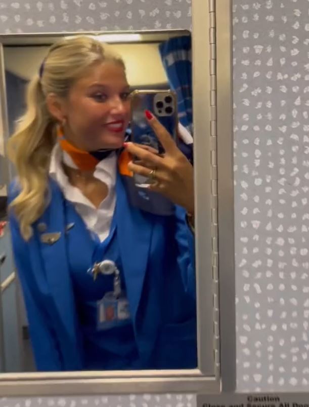 A flight attendant posing in front of a mirror.
