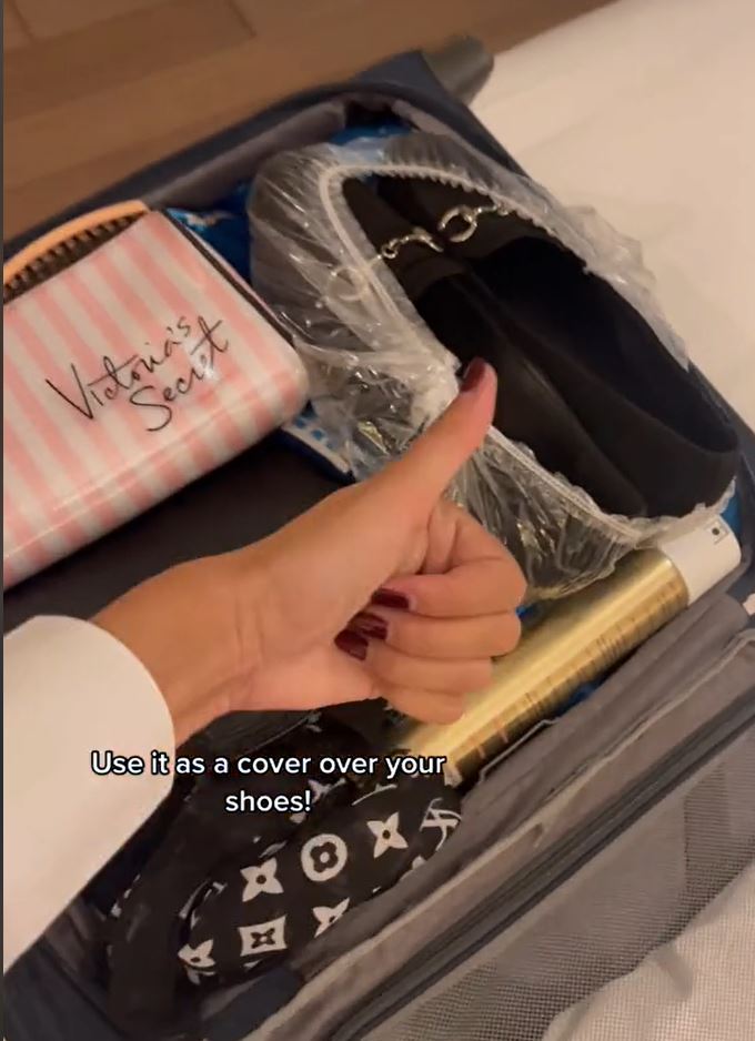 Wrap shoes in a shower cap to keep dirt and germs off your clothes inside the suitcase.